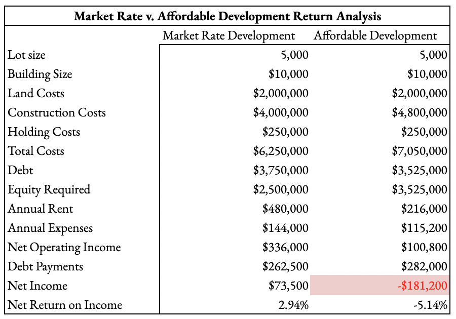 As we can see, without a meaningful subsidy, the Affordable property is operating at a pretty significant loss of $181,200 per year, whereas the market rate building is returning just under 3%. This illustration shows two important things. One, most Affordable units require deep subsidy just to operate. Two, market rate developers don’t make big margins on projects. In fact, they’re paltry, even at $4,000 in rent a month.