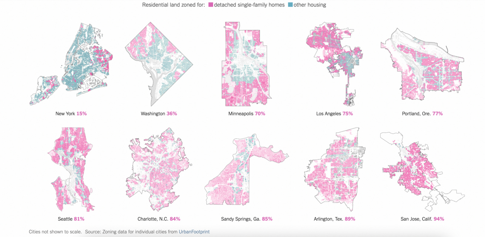 In most major cities, upwards of 70–90% of the land is exclusively zoned for single family homes. Not the suburbs, where almost all of the land is exclusively single family zoned, but the heart of our cities. This is a problem because it doesn’t allow the market to kick into gear and provide housing where it’s most in demand. All else equal, if there’s more demand to live in a certain area, those who have more means will outbid those with less. This effect can be mitigated by building more, but that’s currently illegal.