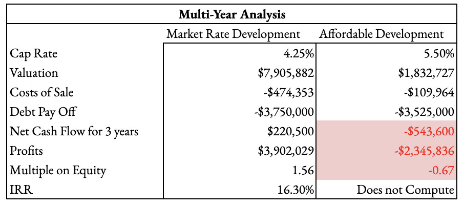 As we can see in the sale analysis below, the market rate development will have a lower cap rate because it’s achieving higher rents without being encumbered by restrictions on rent. As such, it will be valued at nearly $8 million ($336k NOI / 4.25% = $7.9M), while the Affordable Development would generously be valued around $2 million based on its cash flows.