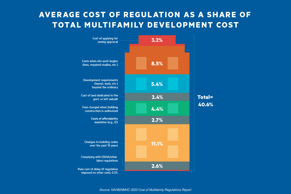 A recent analysis from the National Multifamily Housing Council found that 41% of all development costs are attributable to regulation. Said another way, the average development costs 41% more than it otherwise would absent regulations. The extent and impact of added costs has been corroborated with increasing frequency, including in a 2015 paper which explained “[t]he vast majority of studies have found that locations with more regulation have higher house prices and less construction.”